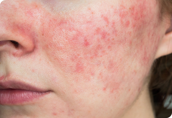 Pastāvīgs sejas apsārtums,redzami asinsvadi.